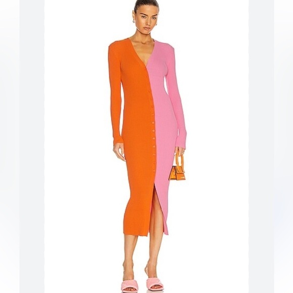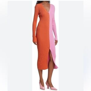 Dee Elly Pink and Orange Ribbed Button Down Midi Sweater Dress