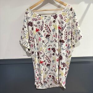 This tunic showcases a delightful floral print in pink and purple, offering a relaxed and boxy fit. The short sleeves and airy fabric make it perfect for warm days, ensuring comfort and style. Its elegant design is ideal for casual outings, blending effortlessly with your wardrobe.