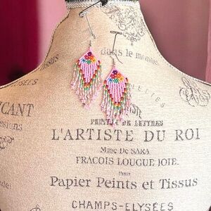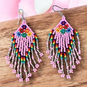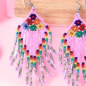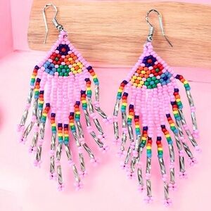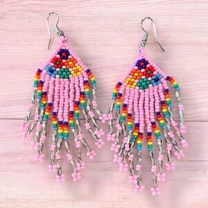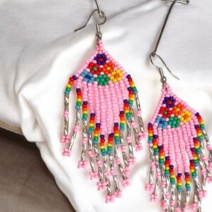 Pink and Silver Beaded Chandelier Earrings Pink Pony Club inspired These handcrafted earrings showcase a stunning blend of pink, silver and rainbow beads forming a striking chandelier design. The intricate beadwork features a rainbow pattern with a distinctive fringe that adds a touch of fun and color. Perfect for making a statement, these earrings are both vibrant and beautiful. Size see picture with US quarter.