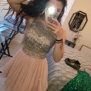 This is a gorgeous dress that I wore only once for a school dance. Sadly, it doesn’t fit me anymore but is still a gorgeous dress. It has a button up back, a sparkly pink skirt, and a matching sparkly pink top with lace detailing. I hope you will enjoy it as much as I did! It says size 1, but it fit me as a 0 as well as a 3. Feel free to ask any questions or make an offer!