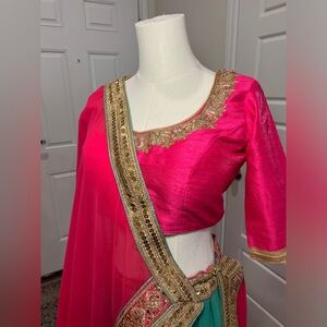 Long sleeves pink blouse with teal lengha. Extra fabric in hem if needs to be opened.