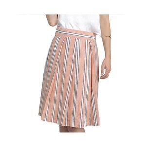 Update your office look with an easy to wear striped and pleated style flare skirt. The peach pink fabric has contrasting white and thin black stripes. Box pleats give it flare without bulk.