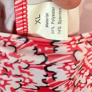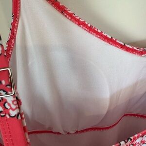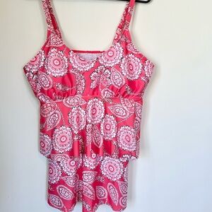 Stylish pink with white floral patterns long length Tankini top with layering/ruffles. Removable soft padding. Adjustable straps.