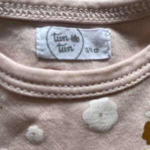 Handmade baby clothing. One-piece footies feature a delightful pink, brown, and white flower scheme.
