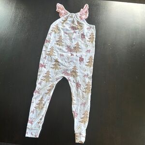 This delightful jumpsuit showcases a charming pink and white pattern, offering a whimsical touch to your collection. With its thin shoulder straps and full-length design that tapers towards the ankles, it ensures both comfort and style. The soft, lightweight fabric makes it perfect for casual outings or relaxed playtime.
