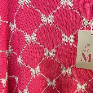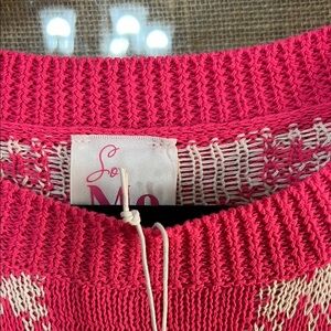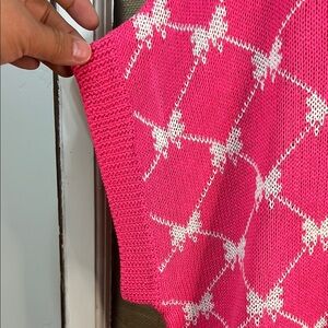 Stylish pink knit sweater with white diamond pattern. Perfect for casual wear.