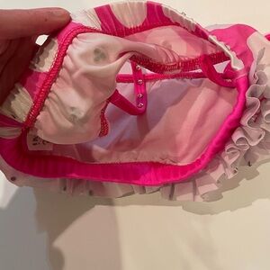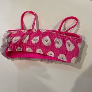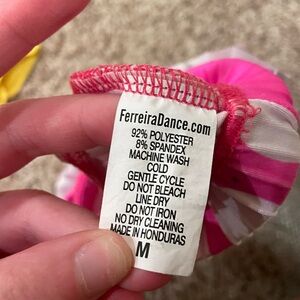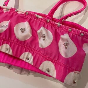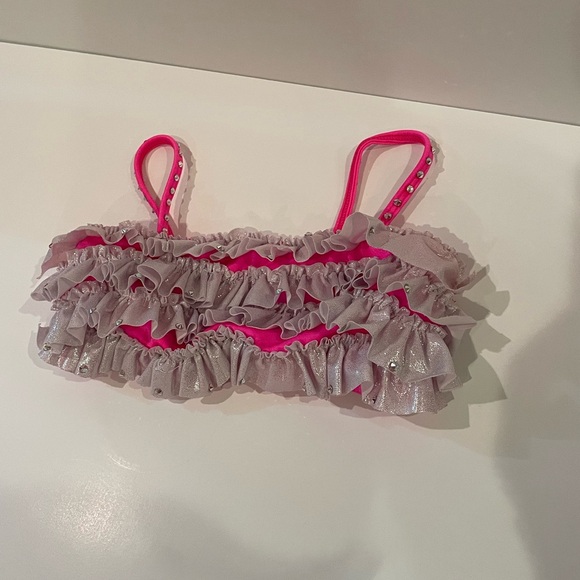Pink and white polka dot top with ruffles. Fits 6-8 yr old. Size medium child. In great condition, minus a few rhinestones have fallen off. Used for dance classes