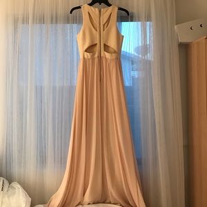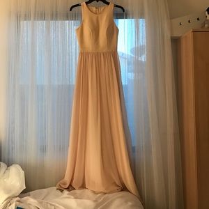Beautiful plain cream bustier, light pastel pink chiffon long skirt, with four open-back slits. I've only worn it once, and it is the original length, I am 5'4 and it would touch the ground slightly, but it has been dry cleaned after the event.