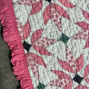 Beautiful quilted blanket with a pink and white floral pattern. Perfect for adding a touch of elegance to any room.