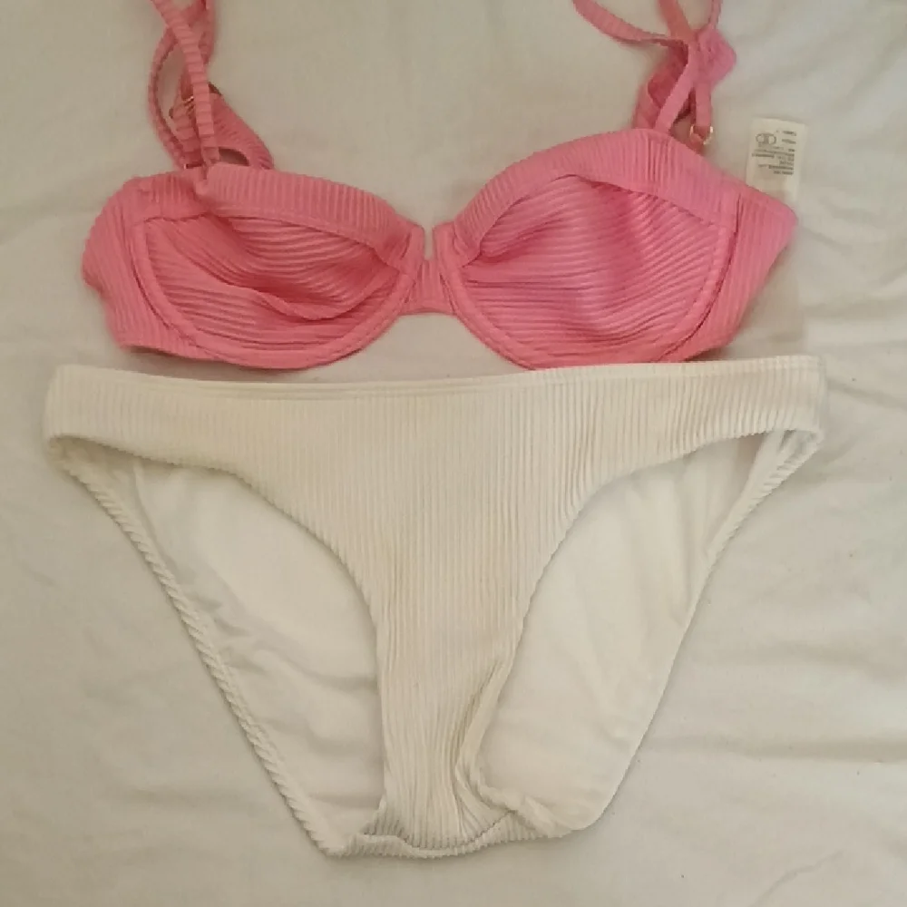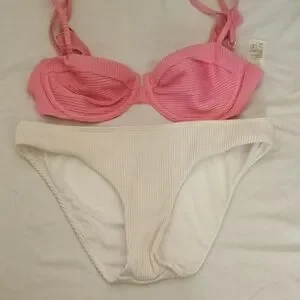 This stylish bikini set features a ribbed design in pink and white. Perfect for a day at the beach or poolside lounging.