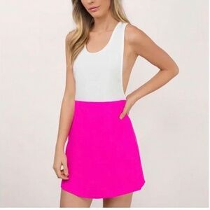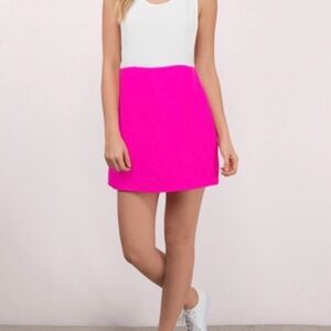 pink/white color block shift dress. The pink is a neon bright pink.