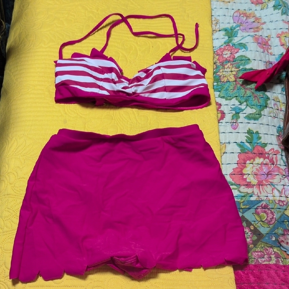 Stylish pink bikini set with white stripes. Includes a top and bottom. Also I took a pic of where there's a tiny stain but hardly noticeable. just wanted to make sure before anyone buys it they do know that's there.