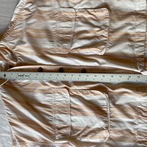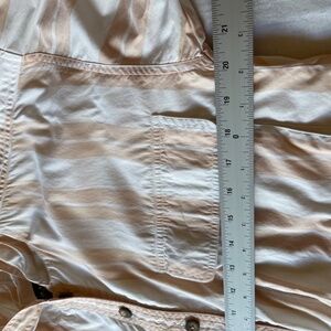 Chic hooded jacket with pink and white stripes. Features button-up front and spacious pockets.