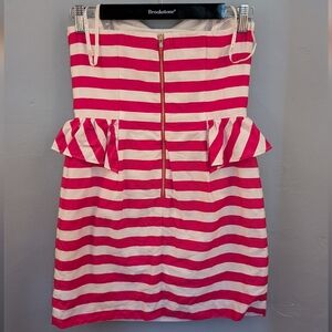 Stylish strapless dress with pink and white stripes. Features a flattering fit with ruffle details.