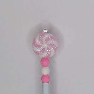 Custom-made pink and white swirl Pen. Features a pink and white lollipop swirl design focal on a white pen base. Perfect for adding a touch of sweetness to your desk.