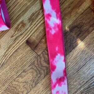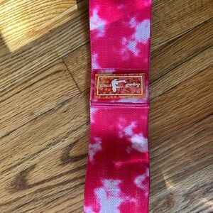 Stylish pink and white tie-dye resistive bands with carrying bags. The square bags zipper is broke.