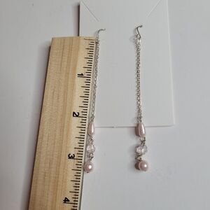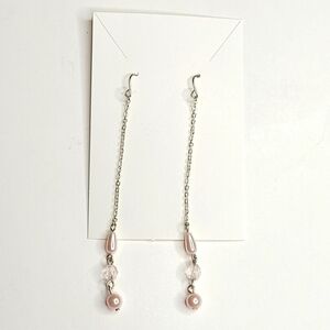 Pink and White with Chain Dangle Earrings - Excellent Condition - Hook Pierced Earrings - Long - Silver Tone Chain Earrings - Dainty