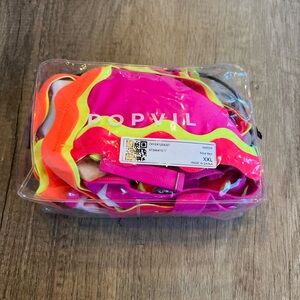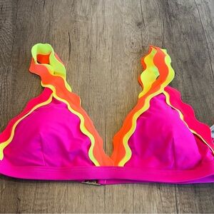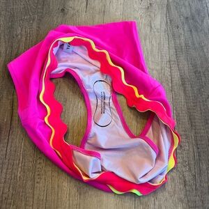 *Never Worn* Dive into summer with this eye-catching bikini set, featuring a vibrant pink base and playful yellow ruffled trim. The triangle top offers a classic style, while the scalloped edge on the bottoms adds a touch of elegance. Crafted from smooth, stretchy material, this bikini ensures comfort and style for any swim occasion.