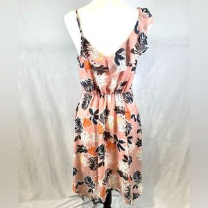 One shoulder ruffle and other shoulder has adjustable spaghetti strap. Chiffon dress with lining. Elastic banded waist. Euc