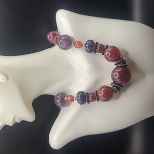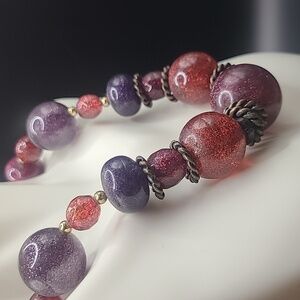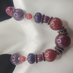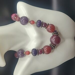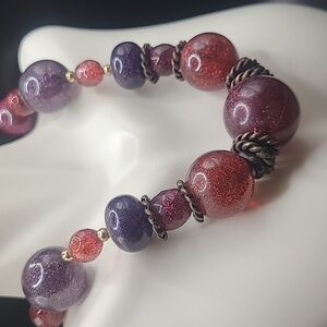 Pink and purple glass like beaded necklace. Vintage. Pre-owned condition. No maker's mark. The length of the necklace is adjustable. It measures in length approximately twenty-one inches.