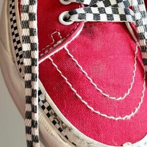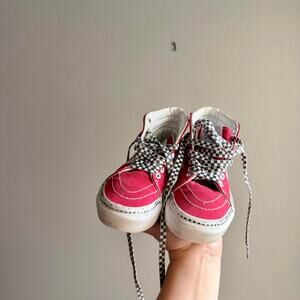 Keywords: Vans toddler high tops, size 13.5 kids Vans, pink red Vans sneakers, retro toddler shoes.