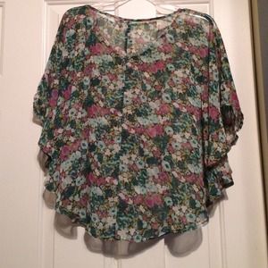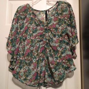 Sheer chiffon top. Pink and teal floral print pattern. Looks super cute with skinnies and heels! Purchased from Nordstrom and only worn a few times. In very good condition.