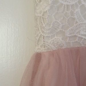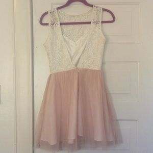 White and pink dress. Has a couple tears as shown in the pictures. The makeup stains are on the inside so no one will be able to see it