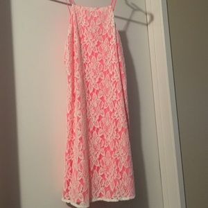 Adorable bright pink dress, perfect for a girls day or night out, and spring & summer. Knee length. Beautiful white lace detail covering the whole dress. Pins and Needles brand, bought from Urban Outfitters.