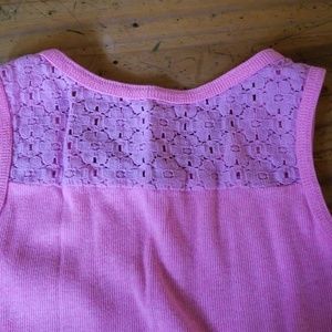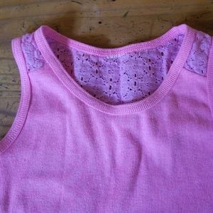 Pink beater flower material on top half of the back side and along shoulder top very cute in EUC no stains or holes the tag i did cut off due to it bothering my daughters back but other then that its perfect