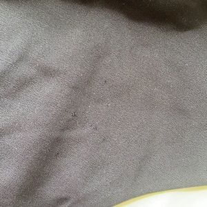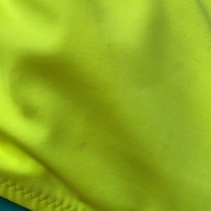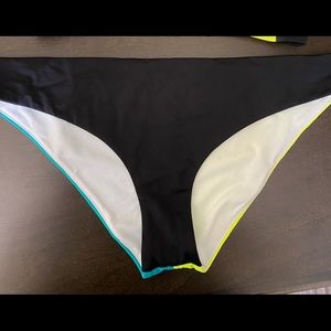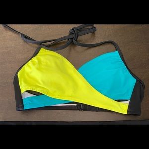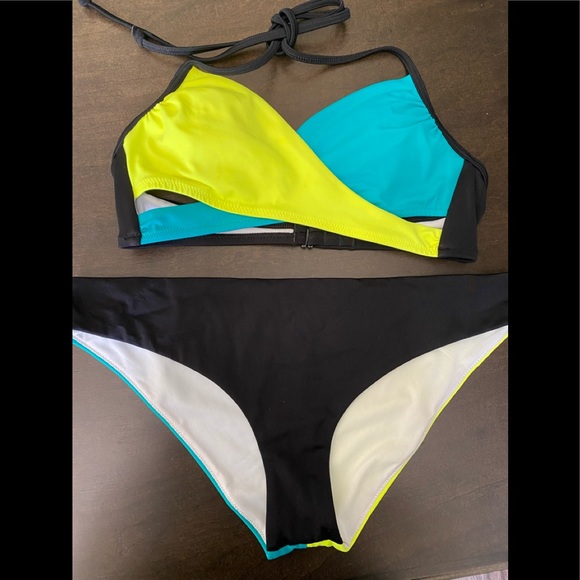 Wrap look top multi colors. Yellow, green black. Bottoms size medium top size is not marked could be size small or medium. Hook back size is adjustable. Neck tie. Small smudge likely will wash off. Never worn. Bottom has small pull, not noticeable. Shown in last pictures. New never worn