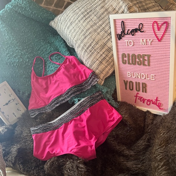 Stylish pink swim bra with gray lace detail. Ideal for beach outings.