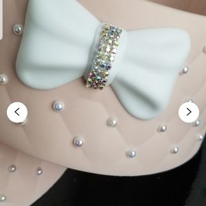 One of a kind set of 2 Pink Bling Pearl pet bowls. Super sparkly and very fancy. Wipe clean. Also available in light grey. 6x6"