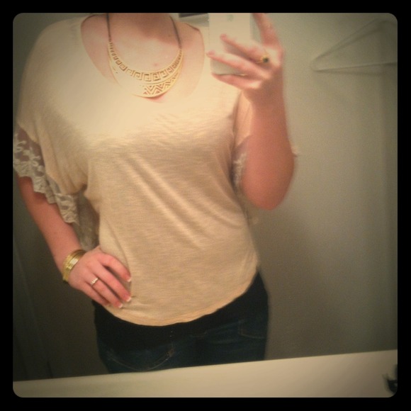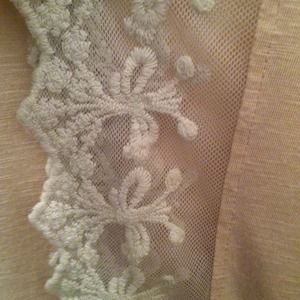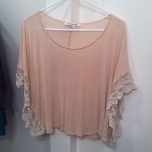 Slight sheer blush color blouse with cream color mesh trim on sides. No seaming so it doesn't have a shape other than a square but that also creates a really cute flowing effect. Helps camouflage mid section. Lightly worn. No damage/stains.