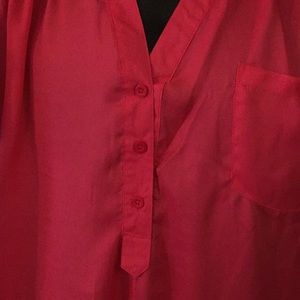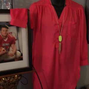 Pics done with and without flash. Top feels like silk and so soft against skin. Gorgeous pinkish coral color. Half button down. 3/4 button sleeve. Stylish