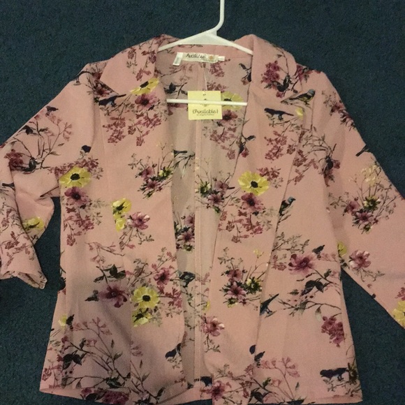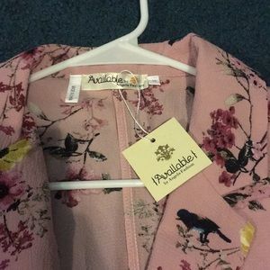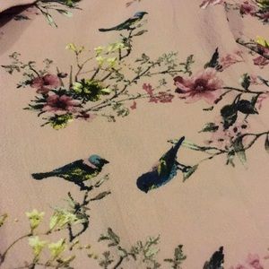 Open blouse with a floral bird pattern. Sleeves are tied at the ends.