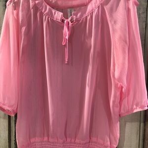 Hot pink 3/4 sleeve sheer crisscross cold shoulder elastic waist and sleeves blouse