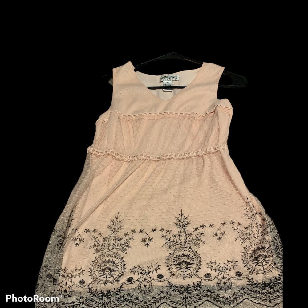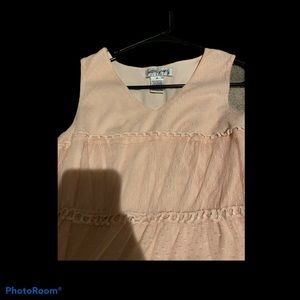 light pink blouse. Is a sleeveless blouse with black lace design on the bottom that is slightly fading. Has a v neck opening and Is from the brand ultra pink. In a size medium but could also fit a small. Willing to lower the price just send me a message please no lowballers thank you.i also bundle.