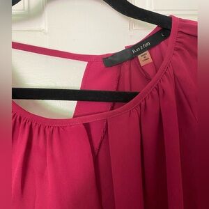 Pink flowy blouse from Stitch Fix. The front has a small keyhole V neck and there is a slightly deeper V on the back. It’s very flowy which makes it very flattering.