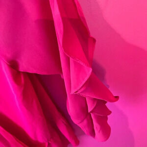 So cute! Ruffles on the sleeves and waistline. V back wrap look with tie. Can be worn backwards!! Really cool