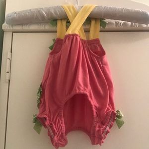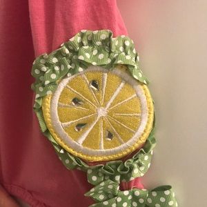 Adorable pink bodysuit for a dog, with green polka dot bows and a bejeweled lemon patch. Jersey material, size small, new with tags. Brand is Sassy Rascal by Max's closet.