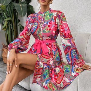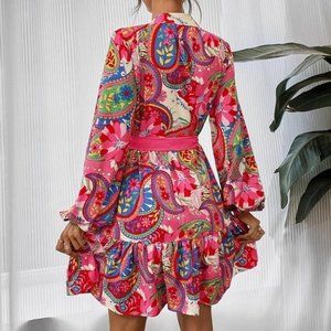 Paisley Print Lantern Sleeve Ruffle Hem Belted Dress