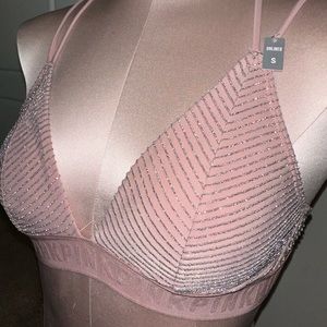 Pink Victoria’s Secret ribbed shimmer bralette and cheeky panty. Logo band. Size S for both pieces. Never worn.
