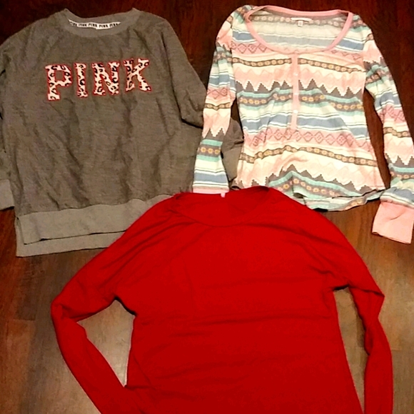 Victoria secret pink bundle all fit a small/medium. Gray shirt says xs. Pink shirt says small. Red shirt has no tag.
