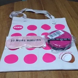 This pink bundle comes with a tote that says pink on it in the bottom says in coconuts we trust, and it also comes with a sleep mask that's pink, and also comes with a sponge that's pink.. These are brand new items. I welcome reasonable offers. Thank you for stopping by my closet and have a wonderful day.