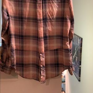 Pink and blue button down; roomie; not too hot or cold; great to throw on after workouts to run errands