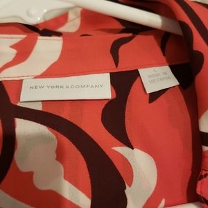 Pink patterned button down blouse, 3 quarter length sleeves and two pockets on the front. Size large purchased from new york & company