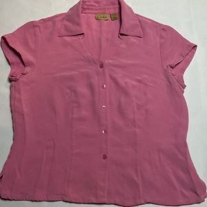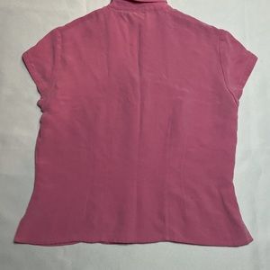 This is a pink, short sleeved, button down. Good for women size small. Good condition, worn once.