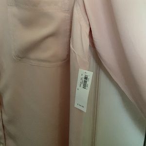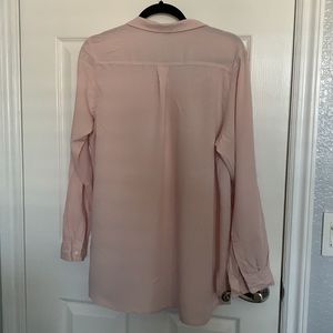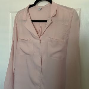 Pink button down blouse with collar and long sleeves with buttons at the end of sleeves.