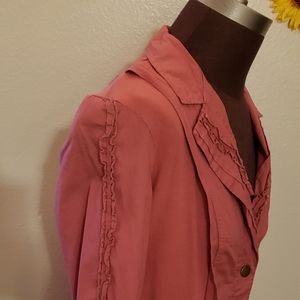 Very pretty and light pink button down blazer, pretty ruffles and cute side pockets