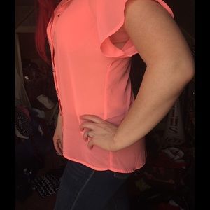 Hot pink silky button down shirt short sleeves cut out shoulder